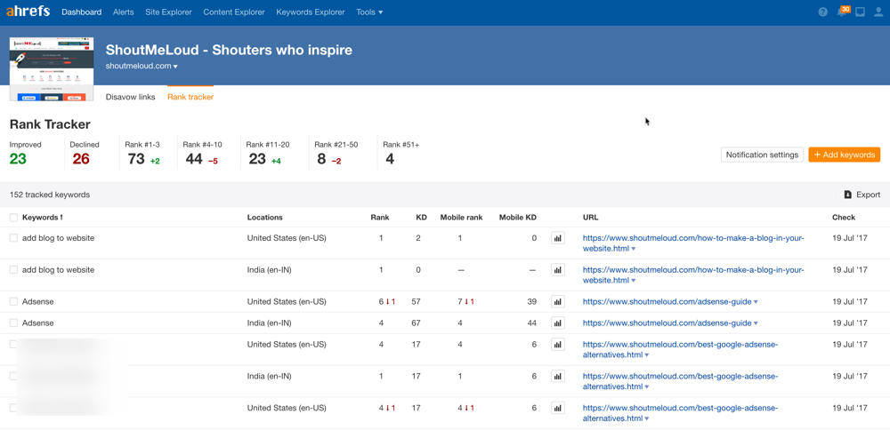 بمجرد ادخال رابط موقعك على Ahrefs فإنه تلقائيا يقوم ب الكشف على الكلمة المفتاحية لموقعك و ترتيبه على اساس اي بلد تريد.