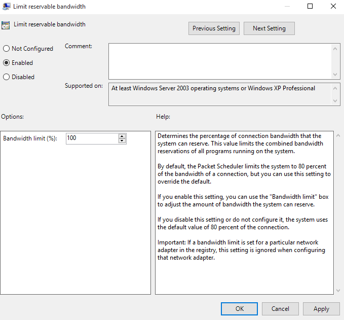 - في النافذة الجديدة التي تظهر ، اختر “Enabled” وقم بتغيير حد النطاق الترددي المقابل (٪) إلى 100