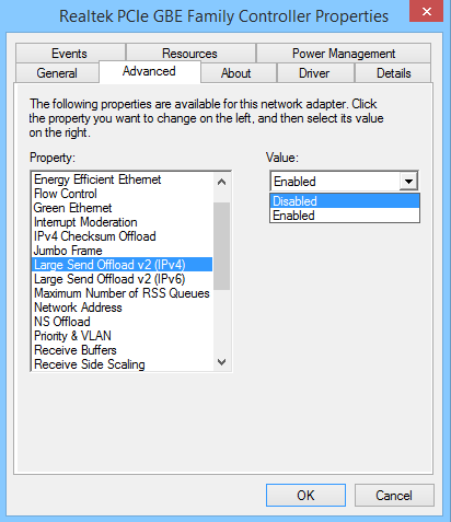 - حدد علامة التبويب “Advanced” وحدد “Large Send Offload V2 (IPv4)” وتعيين القيمة إلى Disabled.