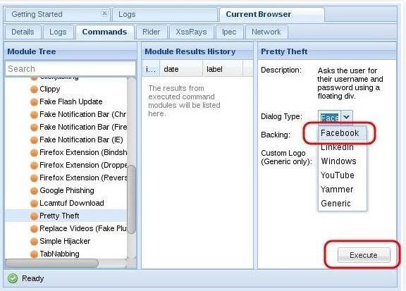 انقر فوق علامة التبويب “Commands” ، ثم قم بالتمرير لأسفل “Modules Tree” حتى تصل إلى “Social Engineering” ثم انقر لتوسيعها. وسوف تعرض العديد من وحدات الهندسة الاجتماعية. انقر على “Pretty Theft” ، والتي ستفتح نافذة “Module Results History” و “Pretty Theft”.