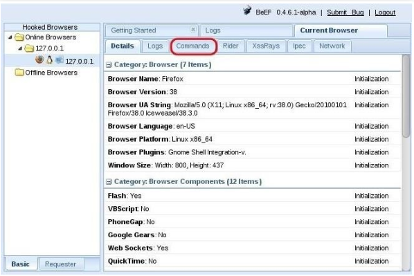 إذا نقرنا على المتصفح Hooked Browsers ، فإنه يفتح واجهة BeEF على الجانب الأيمن. لاحظ أنه يعطينا تفاصيل المتصفح في البداية. كما يوفر لنا عدد من علامات التبويب. لأغراضنا هنا ، نحن مهتمون بعلامة التبويب “Commands” لنقوم بإختراق الفيسبوك عبر كالي لينكس