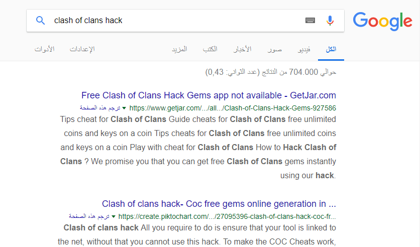 السبب في هاذا أن الموقع الذي يقوم بتنزيل نسخة من كلاش اوف كلانس مهكرة و تكون صحيحة و ليست كذب, سوف يقوم العديد من الأشخاص بمشاركة الموضوع و هاذا هو السبب الذي يجعل من الموقع يضهر في الصفحة الأولى, (وهاذا ما ستفعله أنت و تقوم بمشاركة هاذا الموضوع لأنه مفيد !!!!). على كل حال من المحتمل أن تكون كل المواقع بالإنجليزية و يمكنك إستخدام الترجمة للحصول على رابط التحميل من المواقع.