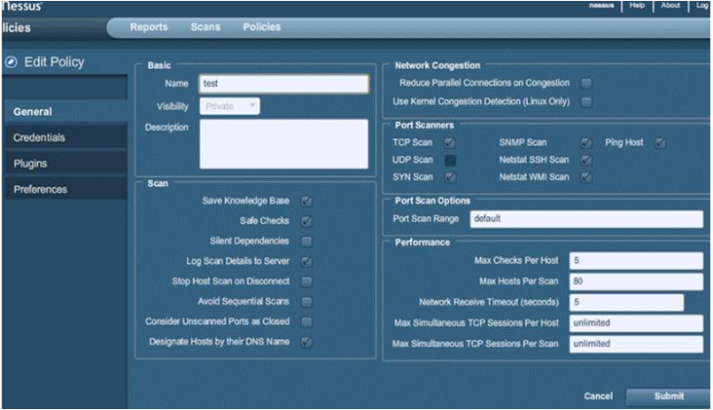 باستخدام أداة Nessus ، يمكن فحص أنواع متعددة من الثغرات التي تشمل الكشف عن الثغرة عن بعد من بين هذه الثغرات ، التنبيه الخاطئ ، Denial Of Service ، إعداد تدقيقات PCI DSS ، اكتشاف البرامج الضارة ، البحث عن البيانات الحساسة ، …. إلخ. لبدء هجوم القاموس ، يمكن أيضا استدعاء أداة هيدرا خارجيا اذا كانت موجودة على جهازك.