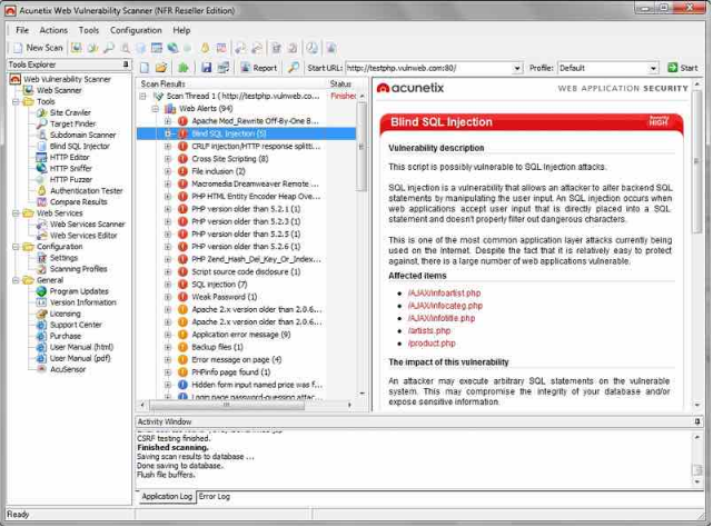 برنامج Acunetix هو من البرامج التي تقوم بفحص الثغرات على المواقع , و لا تقوم بإستغلالها على عكس الأداة الأولى , يقوم هذا البرنامج بفحص العديد من الثغرات على المواقع الإلكترونية مثل ثغرة SQL وم غيرها , و هذا عن طريق ادخال بعض الأكواد في المداخل على الموقع , و أيضا يمكنك عبر استعمال هذا البرنامج فحص مواقع ال WordPress من أكثر من 1200 ثغرة .