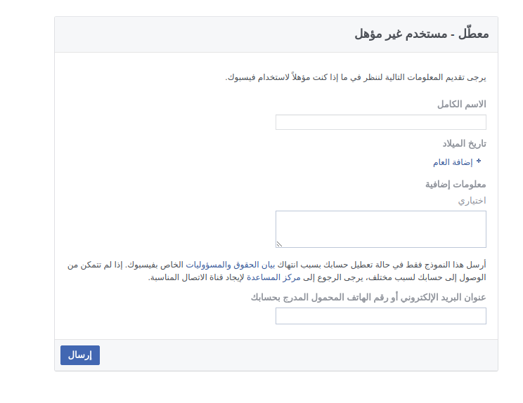 والآن كل ما عليك فعله هو ملئ البيانات و من بينها تاريخ الميلاد في الحساب المعطل و الإسم .