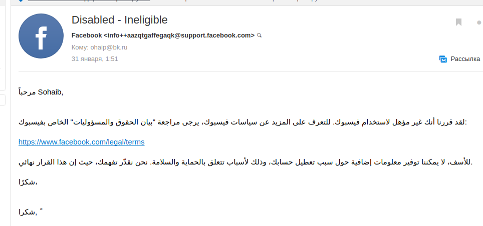 وتعتبر هذه الرسالة آخر رسالة إلكترونية ستتلقاها منا بخصوص حسابك. ولمزيد من المعلومات حول سياساتنا، يُرجى قراءة معايير مجتمع فيسبوك