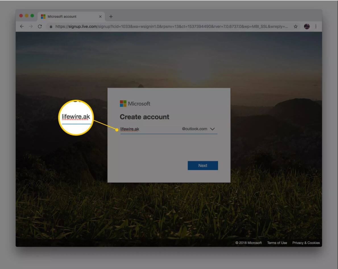 2. أدخل اسم المستخدم الذي تريده و هو  الجزء الذي يأتي قبل @ outlook.com من عنوان البريد الإلكتروني .