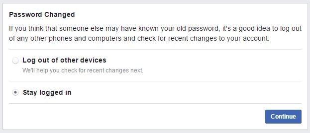 الخطوة 6: سيطلب منك Facebook تسجيل الخروج من أي جهاز تشك في دخوله إلى الحساب. ما عليك سوى النقر على خيار “Stay Logged in” ثم النقر على “متابعة” لاختراق حساب Facebook.