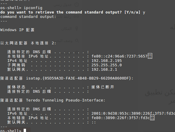 اي ان الرفع قد تم و اعطى لنا جلسة شل في السيرفر يمكن تطبيق اوامر الوندوز عليه مثلا لمعرفة ايبي السيرفر ننفد هادا الامر ipconfig