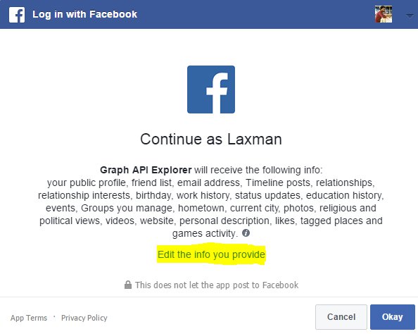 في الكثير من المواقع تجد خيار التسجيل عن طريق حسابك على الفيسبوك و يجب ان تكون على علم ان هذه التطبيقات ليست ل الفيسبوك بل هي لاشخاص اخرين عند النقر فوق تسجيل الدخول باستخدام الفيسبوك،سيتم عرض مربع إذن مع تفاصيل إذن المطلوبة. بمجرد النقر فوق زر موافق، يمكن الوصول إلى التفاصيل الشخصية المطلوبة من حسابك أو يمكن تنفيذ الإجراءات المطلوبة في حساب الفيسبوك نيابة عنك.
