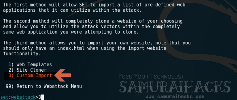 بعد ذلك سيظهر لك ثلاثة خيارات كما هو موضح أدناه ، سيكون الخيار الأول هو “Web Templates” ، حيث يقدم خمسة مواقع محددة مسبقًا تستخدمها للتصيد الاحتيالي. الخيار الثاني هو “Site Cloner” باستخدام هذا الخيار يمكنك استنساخ صفحة تسجيل الدخول لأي موقع والخيار الثالث الذي سنستخدمه في هذاالدرس هو “Custom Import” باستخدام ذلك يمكنك استخدام قالب صفحة تسجيل الدخول الخاص بنا . حدد الخيار 3 “Custom Import” ثم اضغط على Enter.