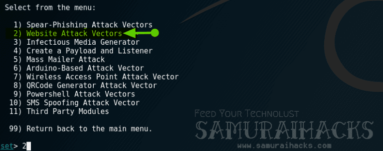 الآن سوف تظهر لك مجموعة أخرى من الخيارات ، اختر “Website Attack Vectors” عن طريق إدخال “2” وإضغط أنتر.