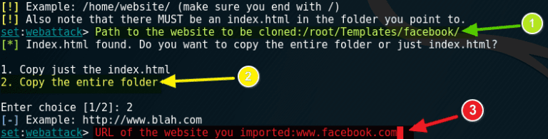 أدخل المسار حيث قمت بتخزين ملف index.html تأكد من إضافة “/” في نهاية المسار. الآن سيظهر لك خياران ، حدد “copy the entire folder” واضغط على Enter. الآن أدخل الموقع الذي تحاول اختراقه. اتبع هذه الخطوات كما هو موضح في الصورة.